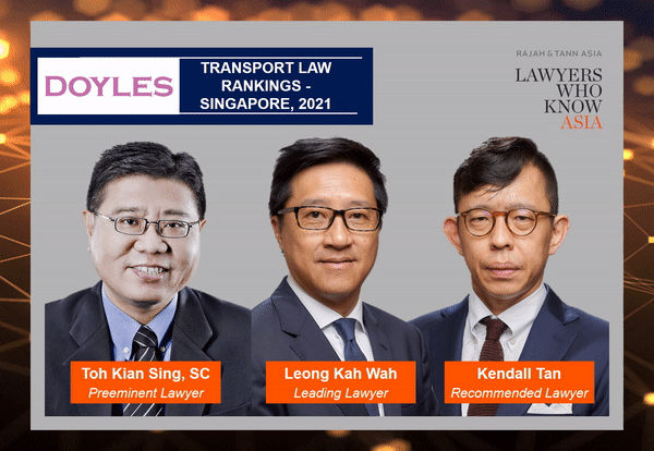 Toh Kian Sing, SC, Leong Kah Wah and Kendall Tan have been identified as Preeminent, Leading and Recommended Lawyers respectively in the Doyle’s Guide 2021 – Singapore Transport Law Rankings.