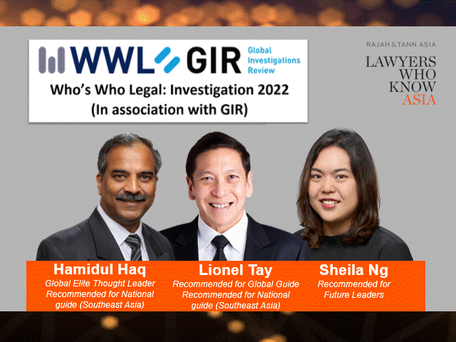 Hamidul Haq (Singapore), Lionel Tay (Singapore)and Sheila Ng (Singapore)highly ranked in Who’s Who Legal: Investigation 2022