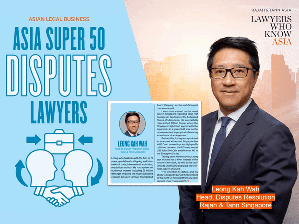 Leong Kah Wah has been identified as one of Asian Legal Business’s Asia Super 50 Disputes Lawyers in ALB’s inaugural list of top disputes lawyers in Asia. Lawyers have been selected based on recommendations from clients including in-house counsel and business decision makers.