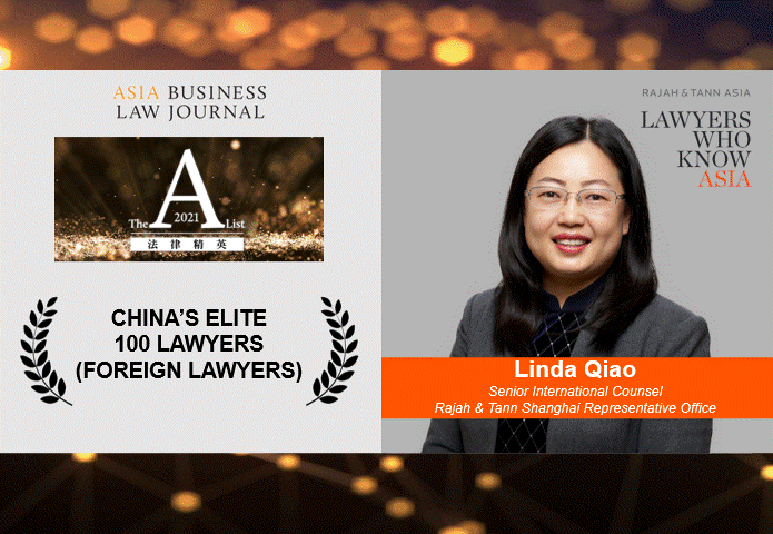 Linda Qiao, Senior International Counsel at Rajah & Tann Shanghai Representative Office, has been recognised as one of China’s Elite 100 Lawyers (foreign lawyers) by China Business Law Journal.