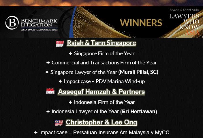 Rajah & Tann Asia (RTA) member firms and their partners have won seven Benchmark Litigation awards, including Singapore Firm of the Year for Rajah & Tann Singapore (R&T Singapore) and Indonesia Firm of the Year for Assegaf Hamzah & Partners (AHP), for the fourth and third consecutive year respectively. R&T Singapore was also named Commercial and Transactions Firm of the Year.