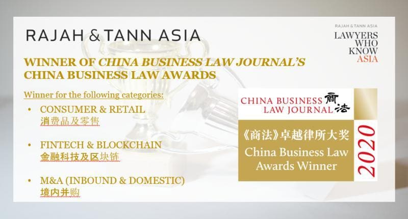 Rajah & Tann (Shanghai Representative Office) has won awards across three categories: Consumer & Retail 消费品及零售, Fintech & Blockchain 金融科技及区块链, M&A (Inbound & Domestic) 境内并购, awarded by China Business Law Journal’s China Business Law Awards.