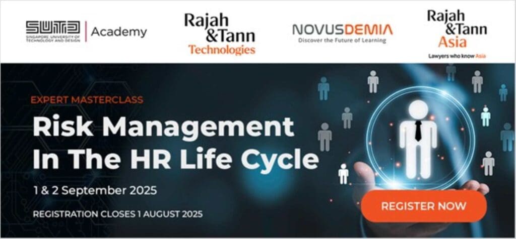 On 1 and 2 September 2025, SUTD Academy, Rajah & Tann Singapore and Rajah & Tann Technologies co-organised an Expert Masterclass on Risk Management in the HR Life Cycle. The two-day interactive masterclass focused on identifying and understanding high-risk human resources (“HR“) touchpoints that can expose a company to legal, compliance, and reputational consequences. The speakers discussed important HR topics including the following: