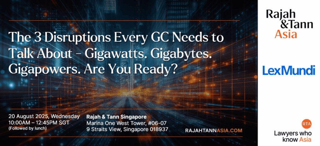 On 20 August 2025, Lex Mundi and Rajah & Tann Singapore co-organised a General Counsel (“GC“) Roundtable titled “The 3 Disruptions Every GC Needs to Talk About – Gigawatts. Gigabytes. Gigapowers. Are You Ready?” The speakers discussed the challenges that GCs face as geodisruptions reshape the regulatory environment of businesses, and how they navigate risks at the intersection of law, business strategy and global change. They also shared insights and practical approaches to managing risk in artificial intelligence (AI) and technology development. The speakers comprised Kala Anandarajah, BBM, Head of the Competition and Antitrust and Trade Practice, and Rajesh Sreenivasan, Head of the Technology, Media & Telecommunications Practice.