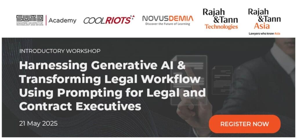 On 21 May 2025, Rajah & Tann Singapore, SUTD Academy, Rajah and Tann Technologies, and Novusdemia organised a workshop titled “Harnessing Generative AI & Transforming Legal Workflow Using Prompting for Legal & Contract Executives”.