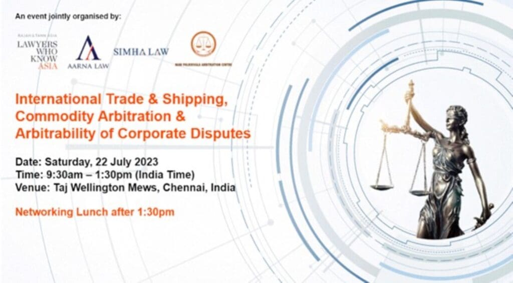 On 22 July 2023, Rajah & Tann Singapore, Aarna Law and Simha Law, and Nani Palkhivala Arbitration Centre (NPAC) jointly organised an event in Chennai, India titled “International Trade & Shipping, Commodity Arbitration & Arbitrability of Corporate Disputes”. V Bala, Deputy Head of the Shipping & International Trade Practice, and Avinash Pradhan, Co-Head of the South Asia Desk and Deputy Head of the International Arbitration Practice, joined other panelists in two panel discussions on: (i) issues surrounding international trade and shipping and commodity arbitration; and (ii) arbitrability of corporate disputes.