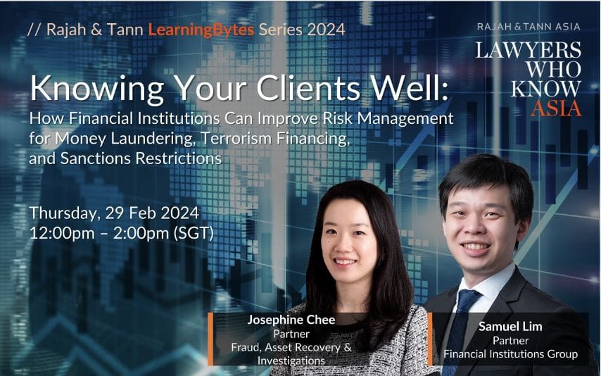 On 29 February 2024, Rajah & Tann organised its monthly seminar series LearningBytes 2024, which brings together subject matter experts to discuss pressing legal and regulatory issues that concern businesses in Singapore and around the region. This month’s seminar focused on “Knowing Your Clients Well: How Financial Institutions Can Improve Risk Management for Money Laundering, Terrorism Financing, and Sanctions Restrictions”.
