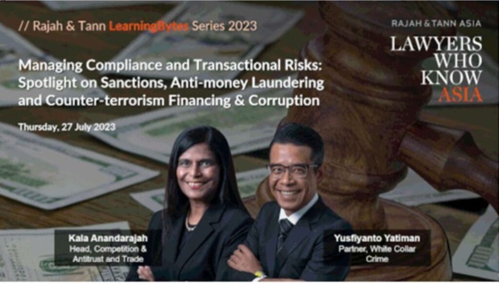 On 27 July 2023, Rajah & Tann organised its monthly “LearningBytes” lunchtime series, with this month’s seminar titled “Managing Compliance and Transactional Risks: Spotlight on Sanctions, Anti-money Laundering and Counter-terrorism Financing & Corruption”. Sanctions figure prominently in all aspects of business so long as it is cross-border or involves another currency for payment. The long arm of some sanctions regimes, including the US sanctions, means their sanctions may apply to individuals even if they are not citizens of that country, or to business entities not organised in that country. Kala Anandarajah, BBM, Head of the Competition & Antitrust and Trade Practice and Partner Yusfiyanto Yatiman from the White Collar Crime Practice discussed the implications of the changing sanctions landscape on businesses. They also touched on the legislative and regulatory frameworks relating to sanctions in order for the businesses to avoid inadvertently supporting, facilitating, or being used as a conduit for money laundering, terrorism financing or corruption.