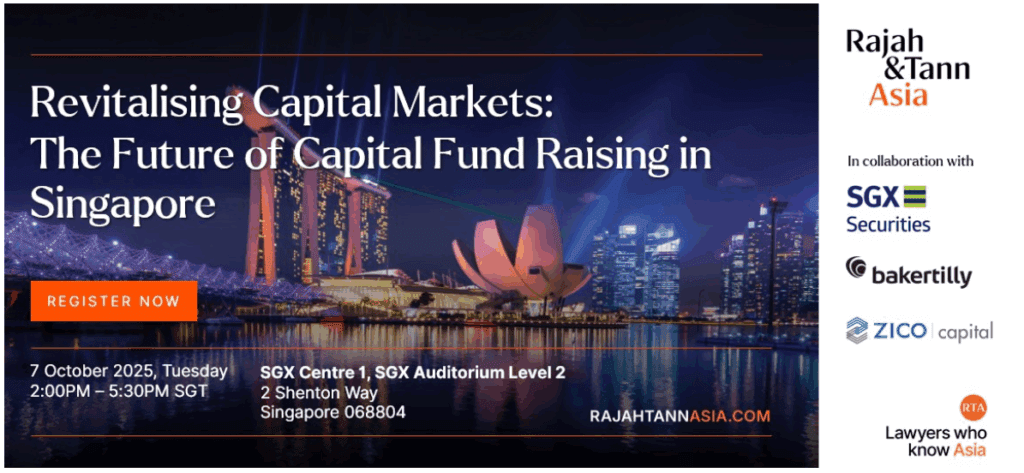 On 7 October 2025, Rajah & Tann Singapore organised a seminar titled “Revitalising Capital Markets: The Future of Capital Fund Raising in Singapore” in collaboration with Singapore Exchange Limited (“SGX“), Baker Tilly Singapore (“Baker Tilly“), and Zico Capital Pte Ltd (“Zico Capital“). Now in its third year, the flagship seminar brought together industry leaders and market participants to discuss the evolving landscape of Singapore’s capital markets and explore new opportunities for public listings and fundraising.