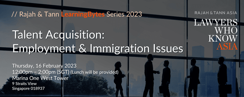 On 16 February 2023, Rajah & Tann organised the “LearningBytes” seminar titled “Talent Acquisition: Employment & Immigration Issues”. Doreen Chia and Ang Tze Phern from our cross-disciplinary Employment & Benefits Practice shared about confidentiality obligations and dealing with non-competition and non-solicitation obligations for employees. Senior Associate Jonathan Cham provided insights on recent changes to the work pass regime in Singapore.